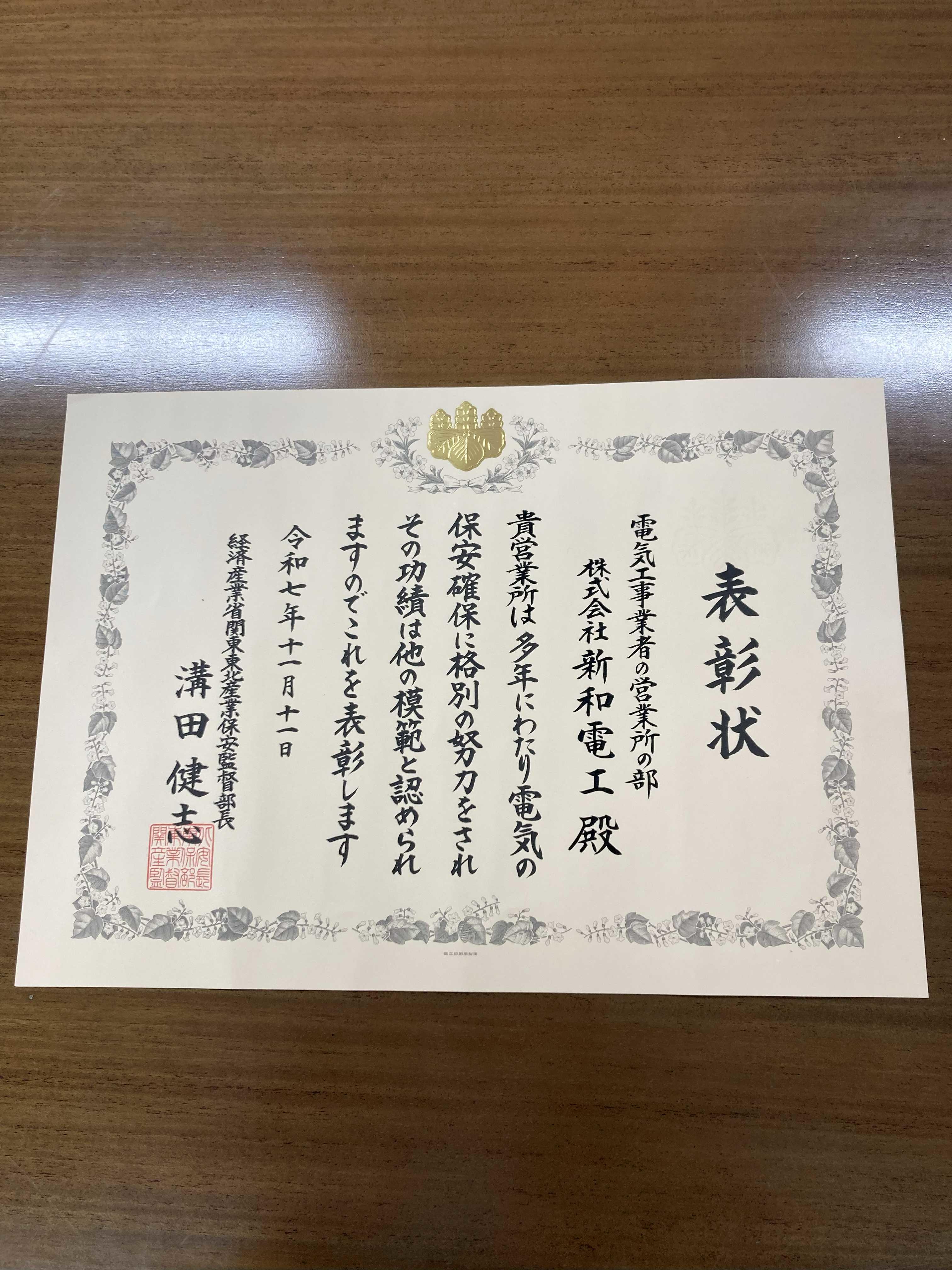 株式会社新和電工は、令和7年度「電気保安功労者 関東東北産業保安監督部長表彰」に